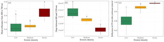 Boxplots of laboratory spectral indices of topsoil used for spectral separation of erosion intensity classes. (a) Mean reflectance over the visible region (400–780 nm), (b) slope between 800 and 1350 nm, and (c) continuum-removed reflectance value at 670 nm. Different letters indicate significant differences among the three groups (p < 0.05).