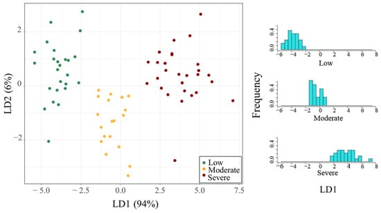 Classification of three erosion intensity classes based on linear discriminant analysis (LDA) of PC scores derived from Sentinel-2 bare soil spectra. Histograms on the right show the distribution of the first LD function’s value for the three classes.