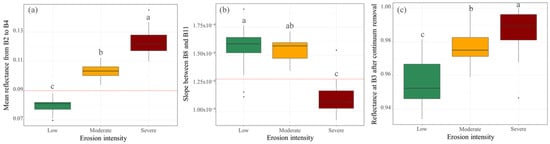 Boxplots of Sentinel-2 spectral indices used for spectral separation of erosion intensity classes. (a) Mean reflectance over the three visible bands (B2, B3, B4), (b) slope between B8 and B11, and (c) continuum-removed reflectance value at 670 nm. Different letters indicate significant differences among the three groups (p < 0.05).