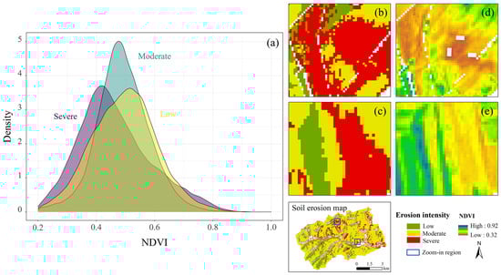 (a) Density plots of NDVI in June 2021 for the three erosion intensity classes within the cropland extent; (b,c) zoomed-in areas with detailed soil erosion pattern and (d,e) the corresponding field-scale NDVI maps to depict the relation of crop variability with erosion-induced variations in soil productivity.