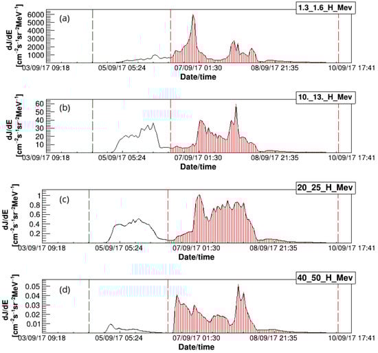 Hourly time series (UT) for several different proton channels from SOHO/ERNE ((a) 1.3–1.6 MeV, (b) 10–13 MeV, (c) 20–25 MeV, (d) 40–50 MeV channels’ energy bands) for September 2017. Integration interval for spectral fluence is indicated with red vertical dashed lines.