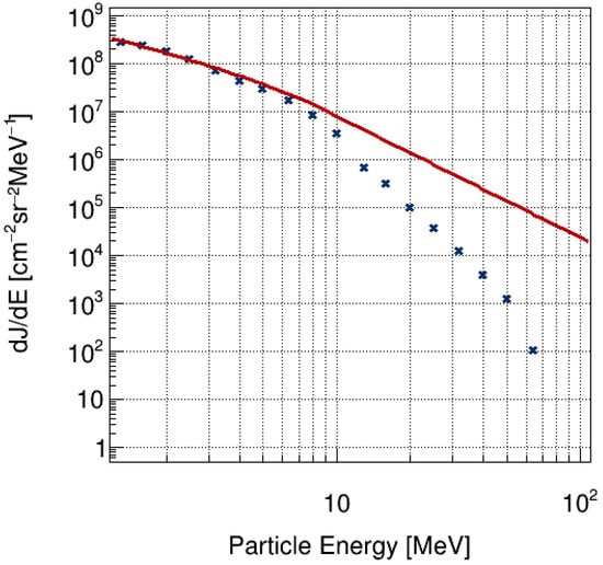 where E is the particle energy, Ek is the “knee” energy (at which the break in the spectrum occurs), a and b are power exponents related to energy ranges below and above Ek, respectively. Exponents a and b are determined by fitting the proton fluence spectrum using Equation 1 and are used to parameterize its shape. Ek is set as a fixed parameter and is determined from the known dependence of “knee” energy on integral fluence. More detailed description of the procedure can be found in []. The shape of fluence spectrum and fitted double power law for the September event are shown in Figure 2. Obtained values were −1.16 for exponent a and −2.5 for exponent b (taking 6.8 MeV as value for “knee” energy).