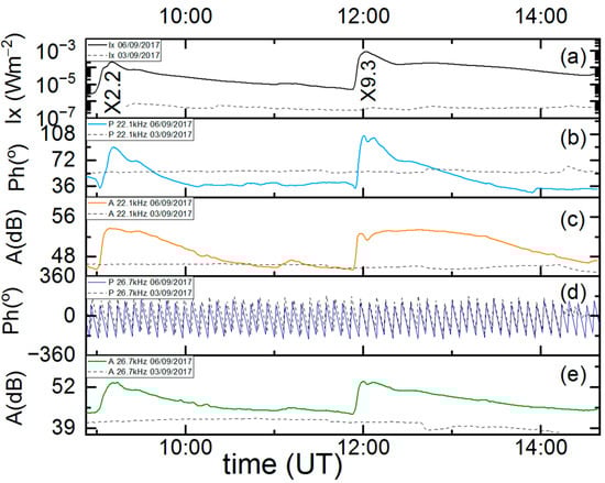 Simultaneous variations of X-ray flux (a) with phase delay, (b) amplitude delay, (c) variations of GQD/22.10 kHz and phase delay, (d) amplitude delay, (e) variations of TBB/26.70 kHz signals versus universal time UT during occurrence of X2.2 and X9.3 class SFs of 6 September 2017. Observed amplitude and phase perturbations with the quiet signal of 3 September 2017 (dashed black) are measured at Belgrade station. Time variation of soft X-ray irradiance is measured by GOES-15 satellite.