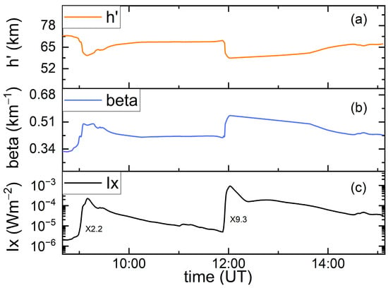 Simultaneous variations of the effective reflection height h’, (a) sharpness β, (b) and X-ray flux (c) during the occurrence of two successive X-ray flares of 6 September 2017.