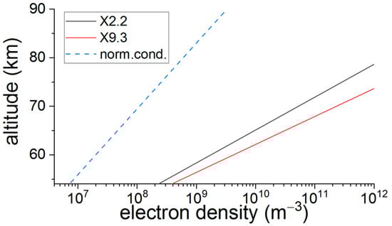 Electron density was calculated at the reflection height, when h = H’ throughout altitude range corresponding to lower ionosphere (50–90 km), but it must be noted that at the range boundaries, results obtained from calculations should be taken with caution due to possible model failure. Electron density profiles corresponding to the influence of two X-class SFs from 6 September 2017, as observed on the GQD signal at BEL station, are given in Figure 5, in black and red for X2.2 and X9.3 SFs respectively, while quiet ionospheric conditions are given in blue. Conducted calculations indicate that Ne for these two SFs differ within one order of magnitude throughout the entire altitude range. Looking separately, at a height of 74 km, compared to unperturbed ionospheric state, Ne increased by almost three and about 3.5 orders of magnitude during the cases of weaker and stronger SF events respectively.