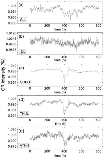 Normalized time series of secondary CR flux detected at several ground and one shallow-underground monitors: (a) ground (GLL) and (b) underground (UL) detector at Belgrade muon station, (c) South pole NM (SOPO), (d) Thule NM (THUL), and (e) Athens NM (ATHN).