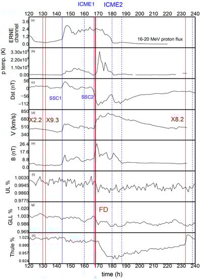 Further insight can be gathered by comparing variability of CR flux measured by different stations, as well as geomagnetic activity and selected space weather parameters for the early part of September, which are presented in Figure 8. One-hour time resolution was used for all data. The ICME list compiled by Richardson and Cane [] and the CME list provided by SOHO/LASCO [] were used to precisely time the near Earth passage of two ICMEs observed during this period (respective time intervals indicated in Figure 8 by dashed blue lines).