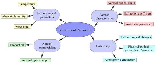 We analyzed the physical–optical properties of aerosols, including the vertical and horizontal distribution characteristics of aerosols and the contributions of different aerosol components in the before-stage, wet-stage, and after-stage in the GBA from 2012 to 2021. The variation mechanism of meteorological and aerosol in the three stages of CWW is further visualized in Figure 15. The conclusions are as follows: