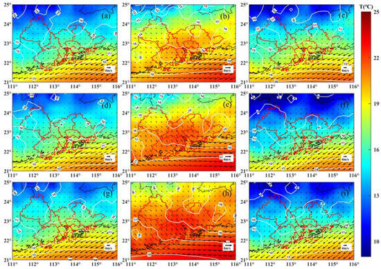 Spatial distribution of meteorological elements under different stages and levels in February and March from 2012 to 2021. (a–c) Slight humidity, (d–f) moderate humidity, and (g–i) heavy humidity; (a,d,g) before-stage, (b,e,h) wet-stage, and (c,f,i) after-stage.