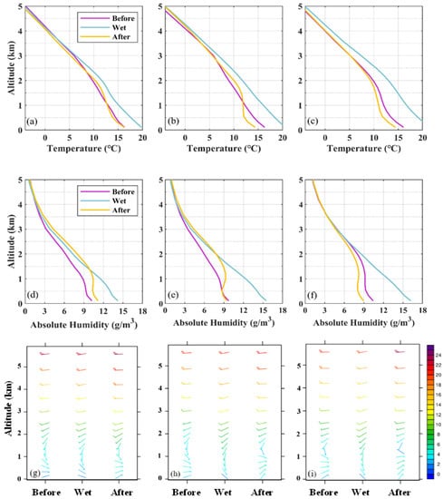 The vertical variation in meteorological conditions in the three stages of CWW is also significant, as shown in Figure 4, which gives the vertical profiles of temperature, absolute humidity, wind speed, and wind direction for the three humidity levels. In Figure 4a–c, the temperature of the wet-stage within 3 km from the ground is significantly higher than that of the before-stage and after-stage, and this difference decreases with the increase in height. In the after-stage, there is a temperature inversion phenomenon at an altitude of about 1 km. The reason why the phenomenon is not obvious is that the value of each level is averaged by multiple samples. During the wet-stage, the wind direction gradually changes from southeasterly to southwesterly with the increase in height. In the after-stage, the northeasterly flow dominates near the surface, especially in heavy humidity; the sustained height reaches about 1 km; and the wind speed gradually increases from 3 m/s to 5 m/s. At this time, the warm and humid airflow in the wet-stage is lifted and concentrated at a height of about 1.2 km above the ground. Thus, in the after-stage, the absolute humidity gradually decreases from the ground up to 0.5 km, at which point, it inverts and starts to rise until it reaches a peak at approximately 1.2 km and then gradually decreases with the altitude increase.