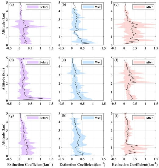 Figure 7 shows the vertical distribution of the aerosol extinction coefficient at different stages. This result is the average of the sample at different stages, for which the before-stage consists of 39 processes and 102 days of data, the wet-stage includes 36 processes and 151 days of data, and the after-stage includes 32 processes and 87 days of data. Because the other time data are not in the study area, the spatial distribution of AOD (Figure 5) and the vertical distribution of aerosols do not represent the same days. The extinction coefficient is an important parameter of aerosol extinction ability, which reflects the load of aerosols in the atmosphere. In the before-stage (Figure 7a,d,g), the surface extinction coefficient reaches a peak value of 0.34 ± 0.25 km−1 in slight humidity. Moreover, the extinction coefficient gradually decreases to the minimum at 1 km, then reaches the second peak value at about 2 km. Obviously, the extinction coefficients decrease significantly with heights below 0.3 km, at which point the maximum value reaches 1.1 km−1. The extinction profile in the wet-stage is similar to that in the before-stage. In the after-stage (Figure 7c,f,i), the high value range of the extinction coefficient occurs in two layers. It is concentrated mainly at 0.2–0.8 km and 2–2.8 km in slight and moderate humidity, while in heavy humidity, the high value is concentrated at 0.3–1.3 km, with the peak extinction coefficient reaching 0.63 km−1.