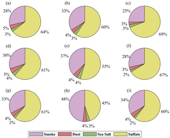 The AOD proportion of sulfate (yellow), sea salt (green), smoke (purple), and dust (pink) under different stages and levels: (a–c) slight humidity, (d–f) moderate humidity, and (g–i) heavy humidity; (a,d,g) before-stage, (b,e,h) wet-stage, and (c,f,i) after-stage.