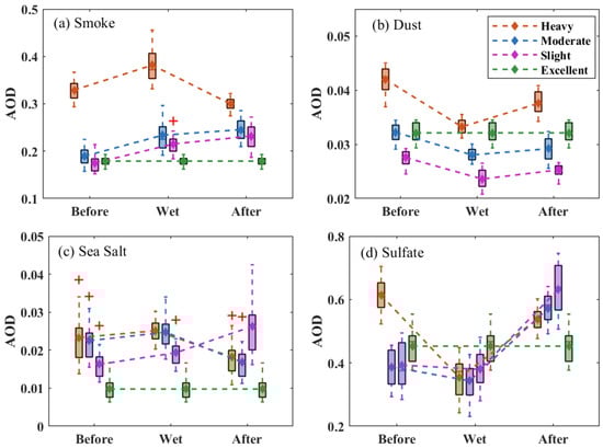 The AOD of (a) smoke, (b) dust, (c) sea salt, and (d) sulfate under different stages and levels. The diamond represents the average values of AOD. The horizontal lines inside the boxes are the medians, and the bottom and top sides of the boxes represent the first and third quartiles. The whiskers are the minimum (maximum) values within 1.5 interquartile ranges of the lower (upper) quartile. The red plus symbol represents the aberrant points with high values.