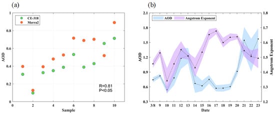(a) Scatter plot of AOD from MERRA-2 and sun photometer. (b) Daily variations of AOD and Angstrom Exponent from 8 to 23 March 2021.