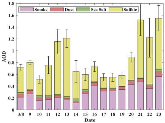 The CWW is cloudy, and the sun photometer observations are missing when there are clouds, but the MERRA-2 data can compensate for this deficiency. To prove the authenticity and validity of MERRA-2 data, we use ground observations to validate MERRA-2 reanalysis products. Feng and Wang [] found that sun photometer observations usually have a high correlation with the AOD retrieved via MERRA-2. Figure 10a shows the correlation between AOD observed by the sun photometer and the MERRA-2 data during the study period. Obviously, the AOD retrieved via MERRA-2 is higher than the corresponding observation; this overestimation has been confirmed in a previous study []. The overestimation may arise because MERRA-2 treats all sulfate aerosols as having the same extinction coefficient and, thus, the same assumed size distribution. Smaller particles are optically more efficient at scattering light compared with larger particles. The correlation R is 0.81 and passes the significance test, so the results based on the MERRA-2 dataset are reliable. Figure 10b shows the daily variation in AOD and AE and the standard deviation for the whole process; it is obvious that the AOD of the before-stage is low, reaching the lowest at 0.52 on 10 March. What is more, the AOD first rises to a peak during the wet-stage, and then quickly drops to a lower level from 14 to 19 March. Meanwhile, the AE reached a maximum value until 20 March, indicating that this stage is dominated by fine particles []. The AOD rapidly increases into the after stage to the highest value of 1.52 on 21 March. In fact, both peaks and valleys of AOD are caused by the rapid increase and decrease in sulfate (Figure 11). In particular, the sulfate AOD reached 0.99 and 0.98 on 13 and 21 March, respectively, accounting for 81% and 64% of the total AOD. From 16 to 20 March, the sulfate AOD drops rapidly to a minimum under the influence of ocean currents, and at this time, smoke accounts for the majority of the total AOD. This further indicates that the trend in sulfate and total AOD is consistent throughout the process, which shows that sulfate plays a controlling role in the changes of AOD.