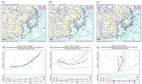 (a–c) Surface weather maps, (d–f) HYSPLIT 36h backward trajectories on 9, 19, and 21 March 2021 and the pentagram represents Zhuhai region.