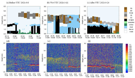 (a–c) The aerosol subtype, (d–f) CALIPSO 532 nm total attenuated backscatter coefficient on 8, 11, and 24 March 2021.