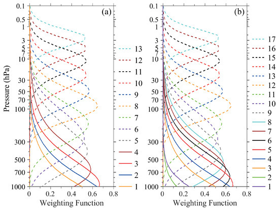 Weighting functions of (a) FY-3D MWTS-2 and (b) FY-3E MWTS-3.