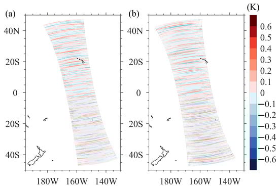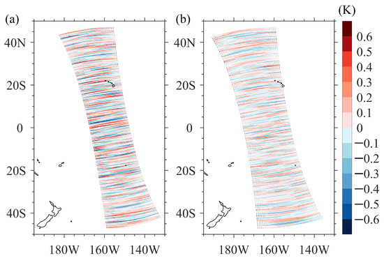 Figure 3 shows the spatial distribution of “” in the 57.290334 ± 0.3222 ± 0.0480 GHz channel for MWTS-2 and MWTS-3 in the Pacific Ocean on 5 October 2021. MWTS-2 shows a negative bias with an average of approximately −1 K, while MWTS-3 shows a positive bias with an average of approximately 1 K. The difference between them is approximately 2 K, which is consistent with the difference in their observed brightness temperatures (2∼3 K) mentioned above. As shown in Figure 3, striping noise appears clearly in the “” distributions of both instruments.