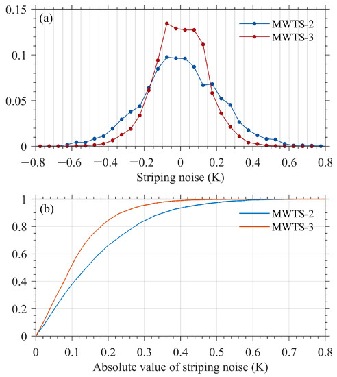 Both MWTS-2’s channel 6 and MWTS-3’s channel 10 have a central frequency of 54.94 GHz, with the weighting function peaking at approximately 300 hPa. Figure 4 shows the spatial striping noise distributions of these two microwave temperature sounders at this frequency in the same region, namely, the Eastern Pacific, on 5 October 2021, each with 300 ascending scan lines. The striping noise intensities of the two were relatively similar: the mean value was approximately 0.1 K and the maximum was less than 0.4 K. However, the striping noise intensity varied significantly between MWTS-2’s channel 10 and MWTS-3’s channel 14. Figure 5 shows that the striping noise of MWTS-2 was much stronger than that of MWTS-3. Figure 6a presents the normalized frequency for the striping noise of the 300 scan lines shown in Figure 5a,b at an interval of 0.05 K. The striping noise of MWTS-3 was concentrated mainly between −0.15 K and +0.15 K, and the frequency within this range was much higher than that of MWTS-2. In contrast, the striping noise of MWTS-2 was more variable and appeared at higher frequencies beyond ±0.15 K than that of MWTS-3. According to the cumulative distribution of the absolute value of the striping noise (Figure 6b), 70% of the striping noise of MWTS-3 fell within the range of ±0.15 K, while nearly half of that of MWTS-2 fell outside that range. As a result, at 57.290334 ± 0.3222 ± 0.0480 GHz, MWTS-2 had stronger striping noise overall.