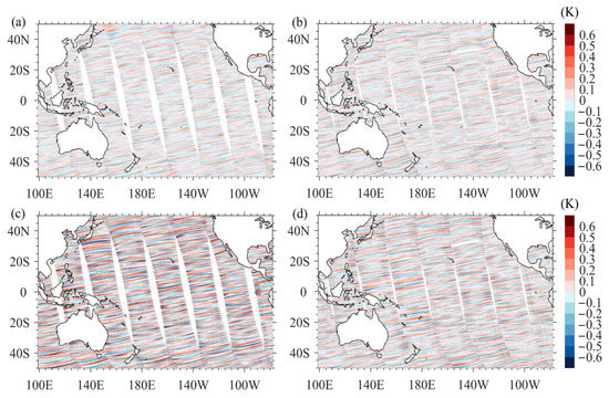 Spatial distributions of striping noise over the Pacific Ocean on 5 October 2021. As in Figure 4, the panels correspond to (a) MWTS-2’s channel 6, (b) MWTS-3’s channel 10, (c) MWTS-2’s channel 10 and (d) MWTS-3’s channel 14.