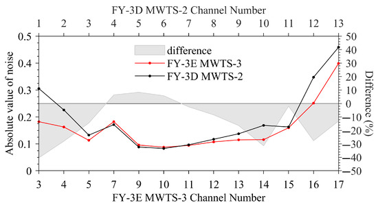 Figure 8 shows the average absolute value of the striping noise over 15 days (24 September to 8 October 2021) in the Pacific Ocean. The channels of the two microwave temperature sounders in Figure 8 were matched according to the frequency, and the gray shaded area is the difference between them. The striping noises of channels 7 to 15 of MWTS-3 (corresponding to channels 4 to 11 of MWTS-2 at altitudes of 700 hPa to 10 hPa) were all less than 0.2 K. The striping noises of near-ground channels and high-frequency channels were relatively strong, with the largest noise appearing in MWTS-2’s channel 13, over 0.4 K. In general, the striping noise of MWTS-3 was weaker than that of MWTS-2. Although the striping noise of MWTS-3 in the middle four continuous channels (channels 7 through 10) was slightly stronger than that of the corresponding MWTS-2 channels, the maximum percentage increase was less than 9%, which was quite small compared with the intensity of the striping noise itself. The intensities of the striping noise of the other channels were all weakened to varying degrees, with a maximum reduction of approximately 42%. This finding shows that FY-3E MWTS-3 was improved with regard to the striping noise, which was well suppressed despite the increased number of FOVs. As mentioned above, the reduction of striping noises could be related to the improvement of the calibration. For a linear calibration, if the temperature of the cold and warm bodies as references are relatively stable, the noise along the track will be relatively small. This is only one possible explanation, and the definite cause of striping noise generation and reduction needs further exploration.