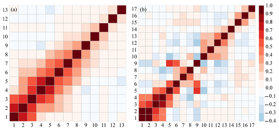 Interchannel correlation coefficients of “” for (a) FY-3D MWTS-2 and (b) FY-3E MWTS-3 calculated from clear-sky marine pixels within the period from 24 September to 8 October 2021.