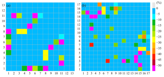 Differences in the interchannel correlation coefficients of observation errors before and after mitigating the striping noise for (a) MWTS-2 and (b) MWTS-3.