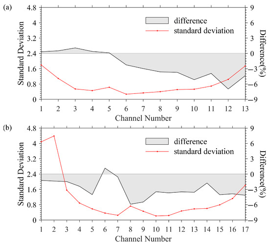 Among the effects of the striping noise on “” characteristics, the variation in the standard deviation is of most concern. Figure 12 shows the change in the “” standard deviation before and after noise mitigation; the red dotted curves represent the original “” standard deviation of each channel, and the gray shaded areas represent the changes. The near-ground sounding channels, especially channels 1 and 2 of MWTS-3, had larger standard deviations. This was because these channels were more sensitive to weather systems, which could result in errors in “” if the simulations were not able to capture the small-scale weather patterns. It can be seen that the observation errors of most channels of the MWTS-3 were reduced after noise mitigation. The most obvious error reduction was in channel 17, with the observation error reduced by nearly 0.1 K. The observation errors of other channels were generally reduced by about 5%, and only the observation error of channel 6 increased slightly. For the FY-3D MWTS-2, the observation errors of those near-ground channels also increased slightly but only by 1%. The observation errors of other channels were all decreased, and the maximum reduction of channel 12 could reach 7%.