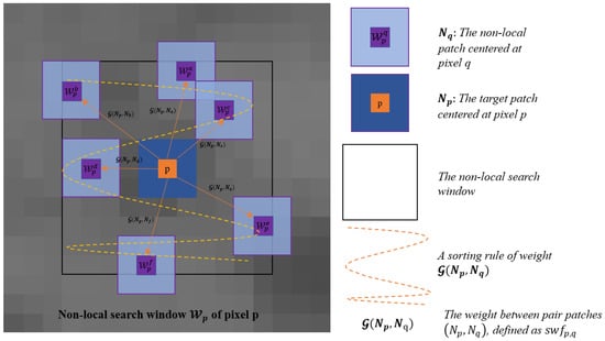 where and represent the neighborhood patch centered at pixel p and pixel q, respectively. denotes the non-local squared search window centered at pixel p and with a size of . Limited by the computational cost, q is only chosen within the r-box radius of p. is normalized constant, i.e., . The weight expresses the similarity between the vectorized patches and and is defined as