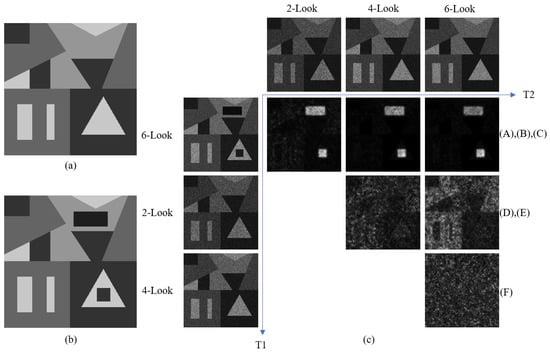 Figure 4a,b are the T1 and T2 images. First, six-look speckle noise was added to the T2 image. Second, 2-look, 4-look, and 6-look speckle noise were added to the T1 image. Then, we defined an image set ---. Figure 4c gives the DI matrix. According to the first row ((A),(B),(C)), it is obvious that the difference between the dual-temporal images can be detected under different numbers of look noise, implying that the proposed NLSW has good feasibility. Even though the noise intensity in the 2-look and 6-look images had a huge disparity, the NLSW features were still able to distinguish changed and unchanged pixels, which indicates that the NLSW is robust to speckle noise. As a note, the only difference between the images in was the number of looks (noise level). Therefore, ideally, no change should be detected between them. (D), (E), and (F) (shown in Figure 4c), representing the DI between any two , confirmed that. Specifically, (D) and (F) showed almost no possible change are, while (E) showed extremely slight possible changes. This is because the huge difference of the speckle noise level between the 2-Look and 6-Look images complicates the change detection.