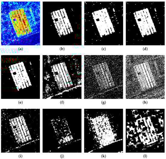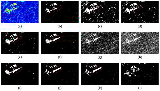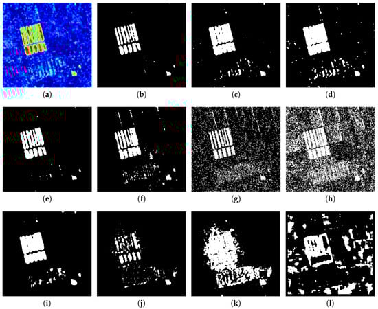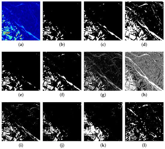 Change maps of the different methods on Dataset . (a) DI of proposed method (heat map). (b) SNLSW-TAE (ours). (c) SNLSW-Otsu (ours). (d) SNLSW-K&I (ours). (e) SNLSW-CFAR (ours). (f) HHG. (g) MRFFCM. (h) LR-FLICM. (i) LR-PCAKmeans. (j) NLPG-Otsu. (k) NLPG-CFAR. (l) SH-Otsu.