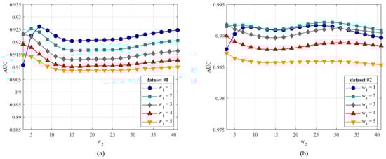 Figure 9a gives the curve on Dataset #1. We can see that the AUC curve rose at first, then gradually declined before staying steady with from 1 to 8. With further increasing, the AUC ascended slowly and remained stable. Figure 9b shows the result on Dataset #2.