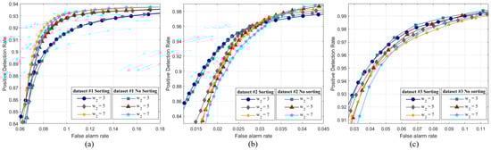 This section aimed at analyzing the performance of the NLSW feature and the sorted NLSW (SNLSW) feature. We carried out the experiments on Datasets #1/2/3. The ROC curve and AUC were used to qualitatively and quantitatively evaluate the performance of the DI generated by the NLSW and SNLSW, respectively. was set as . Figure 10 plots the ROC curves of the NLSW and SNLSW under different parameters. As shown in Figure 10a–c, the SNLSW had a slightly higher ROC than the NLSW in the interval with a small false alarm rate. As the false alarm rate (X-axis) increased, the ROC curves crossed over and showed the opposite. We can note that the NLSW and SNLSW had different performance in different false alarm rate intervals. In general, the NLSW and SNLSW performed similarly. It is possible to select the NLSW and SNLSW based on the FAR requirements for CD tasks.