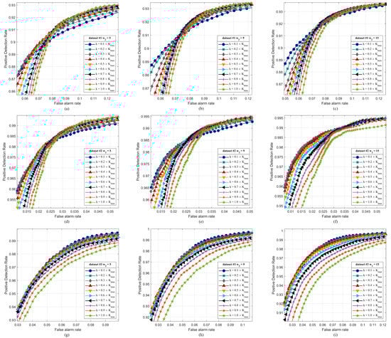 The ROC curves of the SNLSW detector with different K on Datasets #1/2/3. (a–c) ROC curves on Dataset #1. (d–f) ROC curves on Dataset #2. (g–i) ROC curves on Dataset #3.