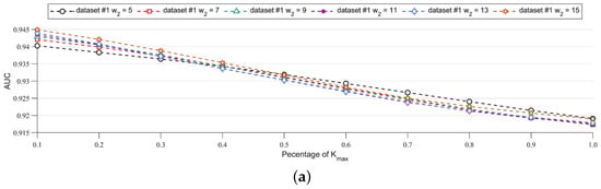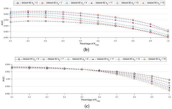 To explore the impact of K, we selected Datasets #1/2/3 as the analysis object. The ROC curve and AUC were used as the qualitative and quantitative indicators, respectively. In the experiments, we set , i.e., took three values. Since K varies with , it is inappropriate to set a series of fixed K. Therefore, we set K as a percentage of , as follows: