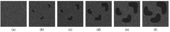 To analyze the effect of the size of the changed regions on the NLSW detector, one approach is to use the simulated data with known changed regions of different sizes. This allows for a controlled comparison of performance across different changed region sizes. First, based on the pre-time image (Figure 13a), we generated five post-time images with different sizes of changed regions corresponding to 2.5%, 4.5%, 10.6%, 22.2%, and 30% of the total image (). Single-look simulated speckle noise with the Gamma distribution was added to the simulated images, as depicted in Figure 13. Then, we ran the algorithm on five dual-temporal pairs with the parameters settings of and .
