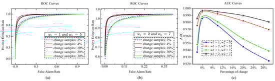 Figure 14a,b show the ROC curves under two parameters, respectively. Figure 14c presents the AUC curves under four groups of parameters. We observed that the optimal size of the changed regions may fall in the range of 4–10% of the image. Our finding revealed that the size of changed regions had some impact on the performance of the NLSW detector with smaller or larger region sizes, resulting in a degraded performance, corresponding to false alarms and misdetections, respectively. However, we can cope with the sensitivity by adjusting the parameters; for example, a large neighborhood can be selected to improve the effectiveness when the changed region is relatively large.