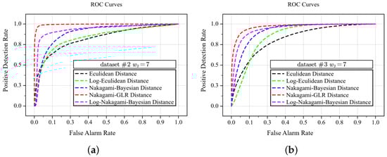 The ROC curves of NLSW detectors with the five different distance metrics. (a) ROC curves on Dataset #2. (b) ROC curves on Dataset #3.