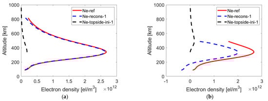 Figure 3). First, the sTEC profile from this reference profile was computed for the known geometry, and then the RO inversion technique was applied, as mentioned in steps 1–4. The left panel shows the initial inverted profile (see the blue curve) when the full sTEC dataset up to the LEO altitude (in the case of COSMIC-1, at about 800 km) was applied. In addition, the right panel shows the initial inverted profile (see the blue curve) when the same sTEC dataset was truncated at a 500 km altitude and used as the input. The black broken line curves show the initial topside model.