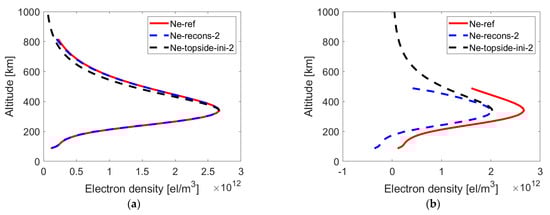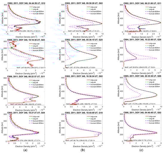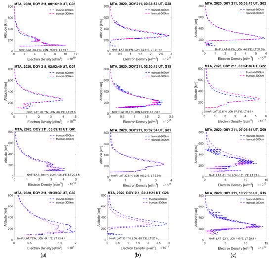 A literature study shows that the peak ionization height of the F2 layer may lie between 250 and 450 km of height above the Earth’s surface. So, if we truncate the data at the 300 km height, in many cases, we only have information about the bottom part of the electron density distribution. It may happen that the peak density will be missed in the remaining data after the truncation. As discussed in the previous sections, a successful RO inversion requires corrections for the topside ionospheric and plasmaspheric contribution. Therefore, if the topside data (an altitude > hm height) is completely missing, the topside contribution cannot be correctly estimated. Therefore, the RO inversion using the truncated data at the 300 km height is very challenging. Nevertheless, we applied the technique to the truncated data, and we found very mixed results. In many cases, the RO inversion cannot retrieve the electron density profiles accurately. However, in some cases, the performance of the model-assisted technique is good, and the retrieved profile is close to the reference profile.