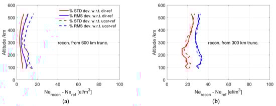 Neref is the reference electron density, or the truth value, at the same height, which was obtained by either the UCAR or the DLR method by applying the complete RO datasets (i.e., no data truncation). Thus, such percentage difference profiles were computed for all of the reconstructed profiles obtained from the truncated data. Then, the root mean square (RMS) and standard deviation (STD) values of the percentage differences were computed at each height level for the height region between 90 and 550 km, considering all available profiles, and plotted in