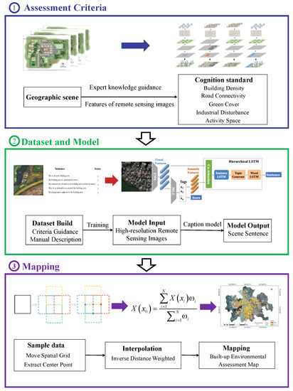 Vision is the main form of human perception, and language is the most powerful tool for human communication with the world [39]. Humans can utilize language to transmit information according to their perception of the geographical environment [40]. This study intends to carry out an environmental assessment from the perspective of spatial understanding of remote-sensing-image scenes. The image-caption model is used to create language descriptions of geographic scenes. The general framework of the proposed methodology is shown in Figure 1. Firstly, it establishes criteria for assessing the urban built environment from remote-sensing images from the perspective of human visual perception. Secondly, we construct an image-caption dataset of the built environment based on the assessment criteria and utilize the dataset to train an image-caption model to support the assessment. Finally, the image-caption model and the assessment criteria are jointly utilized to assess the built environment of Changsha.
