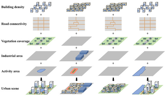 The visual elements in the built-environment scene play a fundamental role in evaluating the built environment from a visual-perception perspective, as shown in Figure 2. Therefore, considering the visibility of distinct urban visual elements in high-resolution remote-sensing images, the following five assessment indicators were established. The specific description of each indicator is given below.