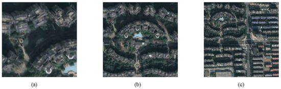 Cropping at different scales results in geographic-scene cells of different spatial extents. If the spatial extent of the scene was too small (Figure 3a), the geographic elements were uniform and could not reflect the surrounding environmental information, resulting in very small differences between such scene units. Conversely, if the spatial extent of the scene was too large (Figure 3c), it was difficult to focus on the local spatial environment because it contained many geographic elements. In order to determine the appropriate scene-unit size, this study carried out scene-unit division with different scale sizes and finally decided to use an image block with a size of 250 × 250 as the basic unit. The scene unit of this scale can include a reasonable number of geographic elements and information about the surroundings, thus facilitating the urban-built-environment assessment in this study. After cropping the remote-sensing image of the main urban area of Changsha, we obtained a total of 3874 images with a size of 250 × 250.