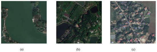 Since this work analyzed the environmental assessment of urban scenes based on remote-sensing images, further filtering of the cropped images was required after obtaining remote-sensing scenes. The principle of filtering is to delete the images that did not contain any building areas and the images that contained architectural areas but did not belong to urban areas. For example, due to the main elements in Figure 4a being water bodies and Figure 4b showing that its main elements are water bodies and forests, both of these images should be filtered out accordingly. In addition, Figure 4c contains many buildings but is located in a rural area; thus, it also does not meet the requirement. Finally, 836 images of these types were discarded.