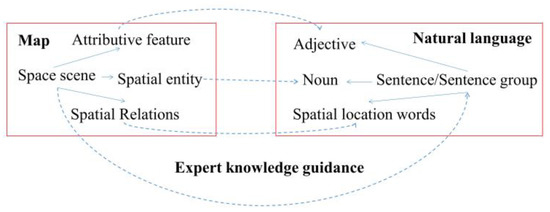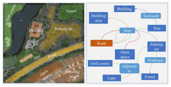 Sketch construction: Spatial relationships can represent the interdependent distribution of geo-objects in the spatial environment and are the key content of spatial understanding in geographic scenes. In this study, we referred to the spatial-relationship expression in [65], which provides a technical basis for generating descriptions of various topics. The sketch construction involves both identifying geographic entities in a scene and extracting sketches based on the spatial relationships among these entities, as shown in Figure 5.