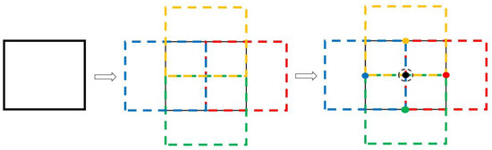 Therefore, this paper adopted the interpolation method after sampling to reduce the effect of cropping. At first, we increased the sampling in two steps: (1) The initial sampling spatial-grid unit was moved to the four directions of east, south, west, and north, and the moving distance was 1/2 of the range of the spatial grid unit, that is, 125 pixels. Then, we used the image-caption model to describe the moved spatial-grid unit and obtained the assessment score of each unit. (2) The spatial-grid unit was converted into a center point, which was convenient for subsequent interpolation operations. The attribute of the point was the environmental-assessment score, which was equal to the assessment score of the spatial-grid unit centered on the point. This process aimed to increase the coverage sampling of the original spatial-grid unit and reduce the effect of cropping. The method of moving the spatial-grid unit and obtaining the center point is shown in Figure 9.