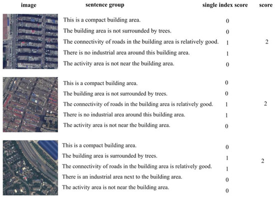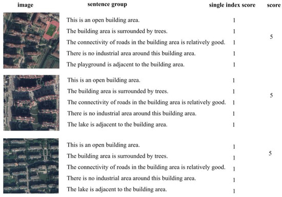 Next, the remaining 3038 remote-sensing-scene images needed to be labeled to establish the Environmental Assessment Dataset. To this end, 10 senior GIS students were invited as volunteers to manually describe and assign scores to each image. The newly recruited volunteers were trained in two steps. The first step was sketch construction, which focused on identifying geo-objects and their spatial relationships. The second step was sentence expression, which mainly included elimination of irrelevant geo-objects and natural-language description. After the training, all of the volunteers were assigned to practice describing the same images many times until they could achieve the same perception in most cases.