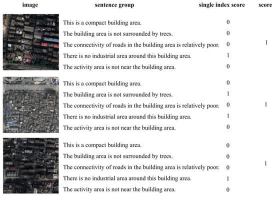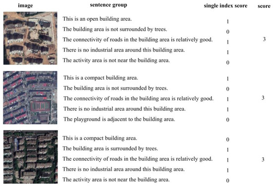 These results also show that our method can evaluate geographic scenes from a visual perspective and can simulate human cognition and discriminate environmental quality. (1) For scene units with scores of 5, the quality of the five evaluation indicators was relatively high, which was represented by an open-building layout, high vegetation coverage, good road connectivity, no industrial interference, and space for leisure activities. (2) For scene units with scores of 4, most of them performed well in the four indicators of building density, vegetation coverage, road connectivity, and industrial area, but it was difficult to meet the indicator of the activity area. (3) For scene units with scores of 3, the performance was relatively more diverse; some geographic scenes showed a lack of vegetation coverage but the buildings were more open, and some geographic scenes showed higher vegetation coverage but denser buildings. (4) For scene units with scores of 0, 1, and 2, the indicator of building density performed poorly and most of them lacked vegetation coverage. Among them, scenes with scores of 2 had more open-building density than scenes with scores of 0 and 1, and performed better on the road-connectivity indicator. Scenes with scores of 0 and 1 had dense and irregular buildings, poor road connectivity, and lack vegetation coverage and activity space. Scenes with scores of 0 had industrial areas. The examples in Figure 11, Figure 12, Figure 13, Figure 14, Figure 15 and Figure 16 show that the transition from the highest score to the lowest score is consistent with the results of people’s spatial cognition of geographic scenes, indicating that our method can simulate human perception. The accurate expression of natural language also demonstrates the effectiveness of our assessment method, which can fully describe the specific environmental elements in high-resolution remote sensing images through natural language. These results can fully demonstrate the representativeness of our assessment indicator. Through the organization of five different indicators, the organization of high-resolution remote-sensing-image scene elements can be fully exploited to carry out environmental assessment.
